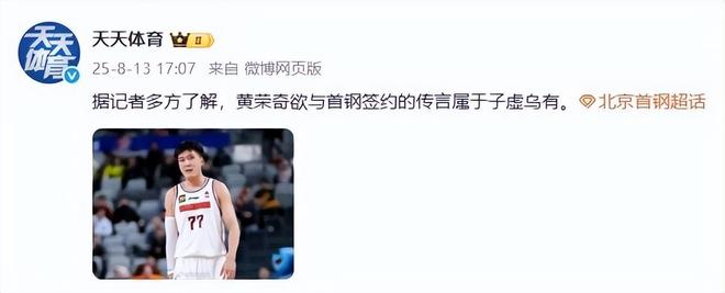 在他還沒有加盟南京同曦隊之前,另外一名媒體人【導演我躺哪】透露,黃榮奇將加盟北京首鋼。不過,北京媒體【天天體育】進行了辟謠,直言據記者多方了解,黃榮奇想要與北京首鋼簽約的傳言屬於子虛烏有。