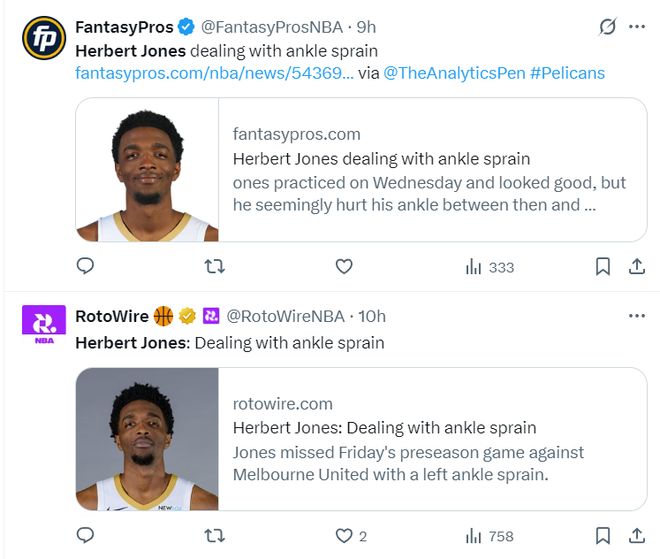 實際上在幾小時前,赫伯特-瓊斯剛剛被曝出又在處理腳踝的傷勢。【今夏瓊斯剛剛與鵜鶘達成一份三年6800萬的提前續約,這份合約將使瓊斯與鵜鶘的合同總價值達到5年9700萬美元,並包含2029-30賽季的球員選項】