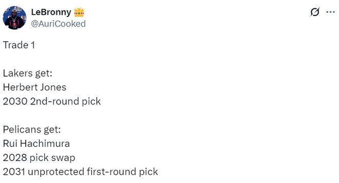 他的方案是湖人送出八村壘+2028年首輪互換權+2031年不保護首輪簽,得到瓊斯+2030年次輪簽,這筆交易鵜鶘等於得到兩個首輪簽,湖人拿出了最大的誠意。這樣瓊斯就可以打先發三號位,防守最好的先發斯瑪特、東契奇、瓊斯、詹姆斯、艾頓。