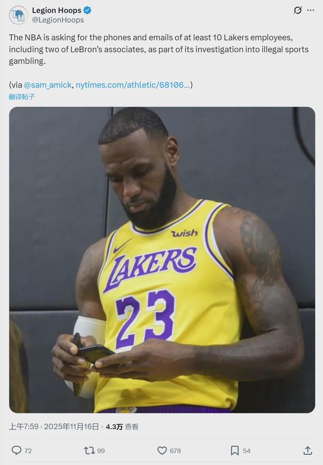 北京時間11月16日上午7點,據The Athletic記者Joe Vardon以及Sam Amick等聯合報道,NBA已經對包括洛杉磯湖人在內的多支球隊展開調查,要求他們交出文件和手機等資料。作為對非法體育賭博調查的一部分,湖人至少10名員工上交手機。