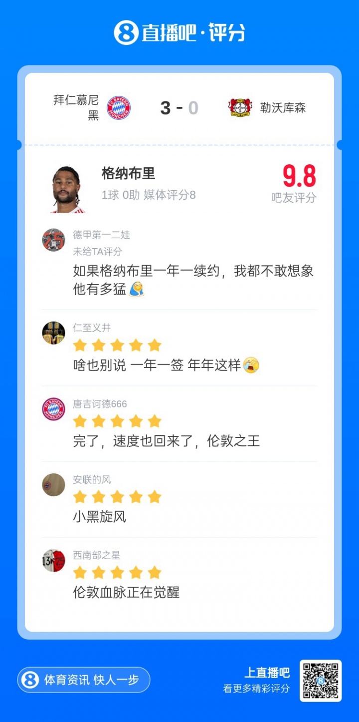 第九輪評選結果出爐,格納布裏首開記錄,幫助拜仁3-0勒沃庫森豪取開局15連勝!最終格納布裏獲得吧友1.6萬票支持,當選【X小紅書德甲第9輪最佳球員】!